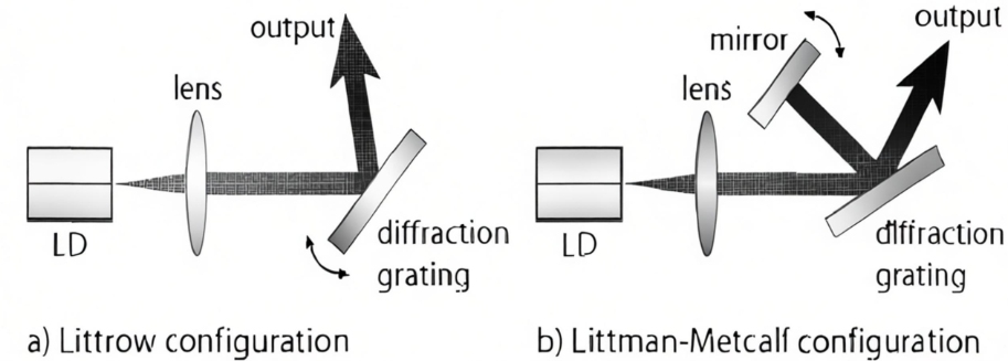 لیزرهای حفره اصلی حفره کوتاه مانند DFB و DBR زمان برهمکنش فوتون درون حفره محدودی دارند و فشردهسازی پهنای خط عمیق را دشوار میکنند. برای فشردهسازی بیشتر پهنای خط و کاهش نویز، چنین پیکربندیهای حفره اصلی با حفره کوتاه اغلب با ساختارهای حفره خارجی برای بهینهسازی عملکرد ترکیب میشوند. ساختارهای معمولی حفره خارجی شامل حفره های خارجی فضایی، حفره های خارجی فیبر و حفره های خارجی موجبر هستند. قبل از توسعه دستگاههای فیبر نوری و ساختارهای موجبر، حفرههای خارجی عمدتاً از اپتیک فضایی همراه با اجزای نوری گسسته تشکیل شده بودند. در این میان، ساختارهای بازخورد فضایی حفره خارجی مبتنی بر گریت، عمدتاً طرحهای Littrow و Littman را اتخاذ میکنند، که معمولاً از یک حفره لیزر، لنزهای جفتکننده و یک توری پراش تشکیل شدهاند. گریتینگ به عنوان عنصر بازخورد، تنظیم طول موج، انتخاب حالت و فشرده سازی پهنای خط را امکان پذیر می کند.