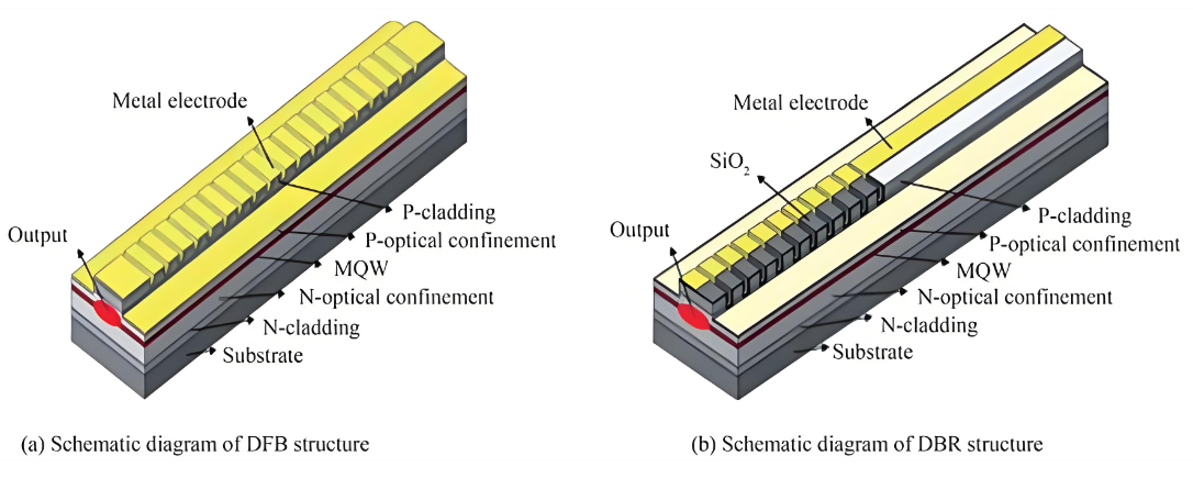 یکی دیگر از ساختارهای تشدید کننده بر اساس گریتینگ های براگ، پیکربندی DFB است. حفره اصلی لیزر DFB ساختار براگ را با ناحیه فعال ادغام می کند و یک ناحیه تغییر فاز را در مرکز ساختار برای انتخاب طول موج معرفی می کند. همانطور که در شکل 3(b) نشان داده شده است، این پیکربندی دارای درجه بالاتری از یکپارچگی و یکپارچگی ساختاری است و مسائلی مانند رانش شدید طول موج و پرش حالت در ساختارهای DBR را کاهش می دهد و آن را به پایدارترین و کاربردی ترین پیکربندی لیزر در مرحله کنونی تبدیل می کند.